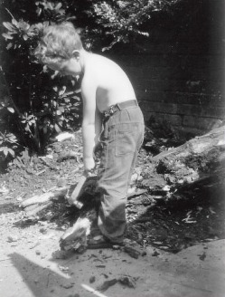 Where it all began... 7-year-old Woody in his garden in Wales working on an old log... Using his father's hammer...and inspired by his mother's unconditional love...